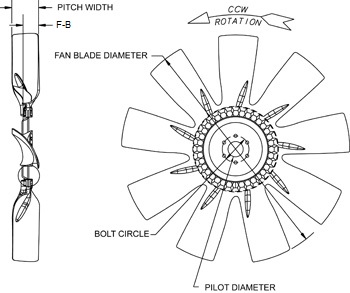 | Fan Blade Diameter (in) | Pilot Diameter (in) | Bolt Circle (in) | Pitch Width (in) | Front Tip of Blade to Back of Mounting Disc (in) | Back of Mounting Disc to Back Tip of Blade (in) | Weight (lbs) | Blades No./Rotation |