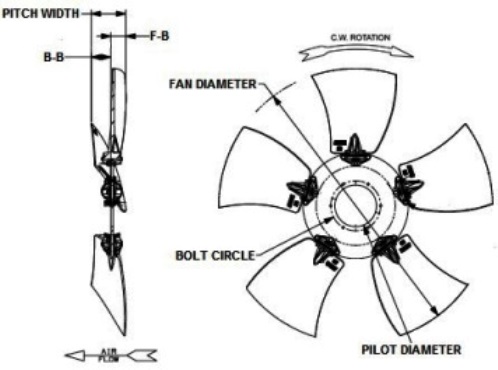 Fan Blade Diameter (in) Pilot Diameter (in) Bolt Circle (in) Pitch Width (in) Front Tip of Blade to Back of Mounting Disc (in) Back of Mounting Disc to Back Tip of Blade (in) Weight (lbs) Blades No./Rotation